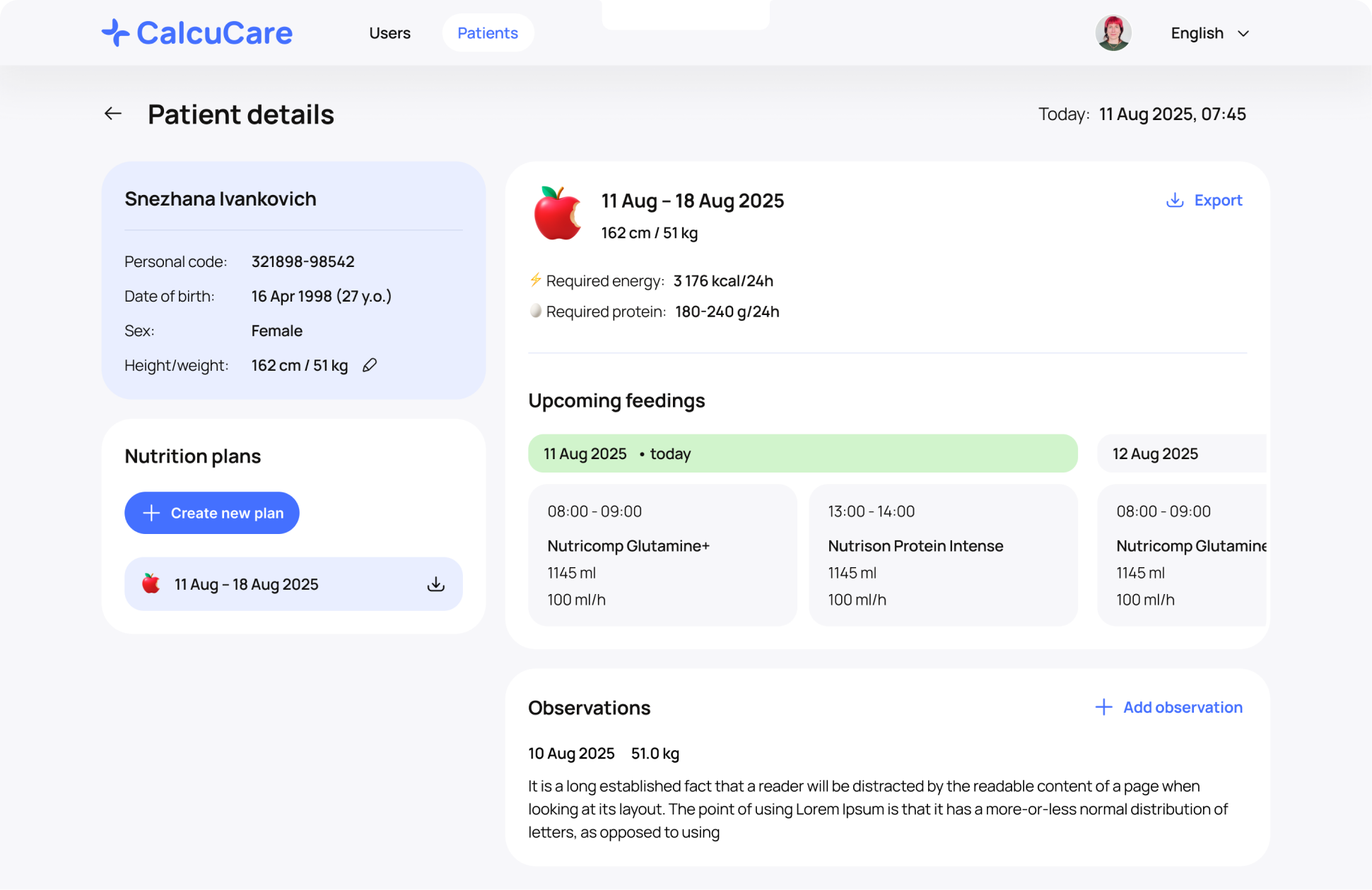 Nutrition specialists use CalcuCare to save time and structure clinical nutrition planning within healthcare institutions.